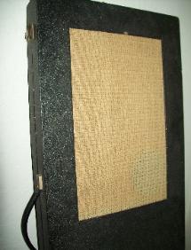 This 1448 is black with a silver glitter finish on the front and back of the guitar as well as the entire case! One tear in the vinyl edging and one scratch on the back of the guitar, otherwise all original and in excellent condition. The amp-in-case (a mighty 3 watts!) works and still had the original Silvertone branded tubes and the original grey instrument cord included. The screened panel on the outside of the case protects the speaker.